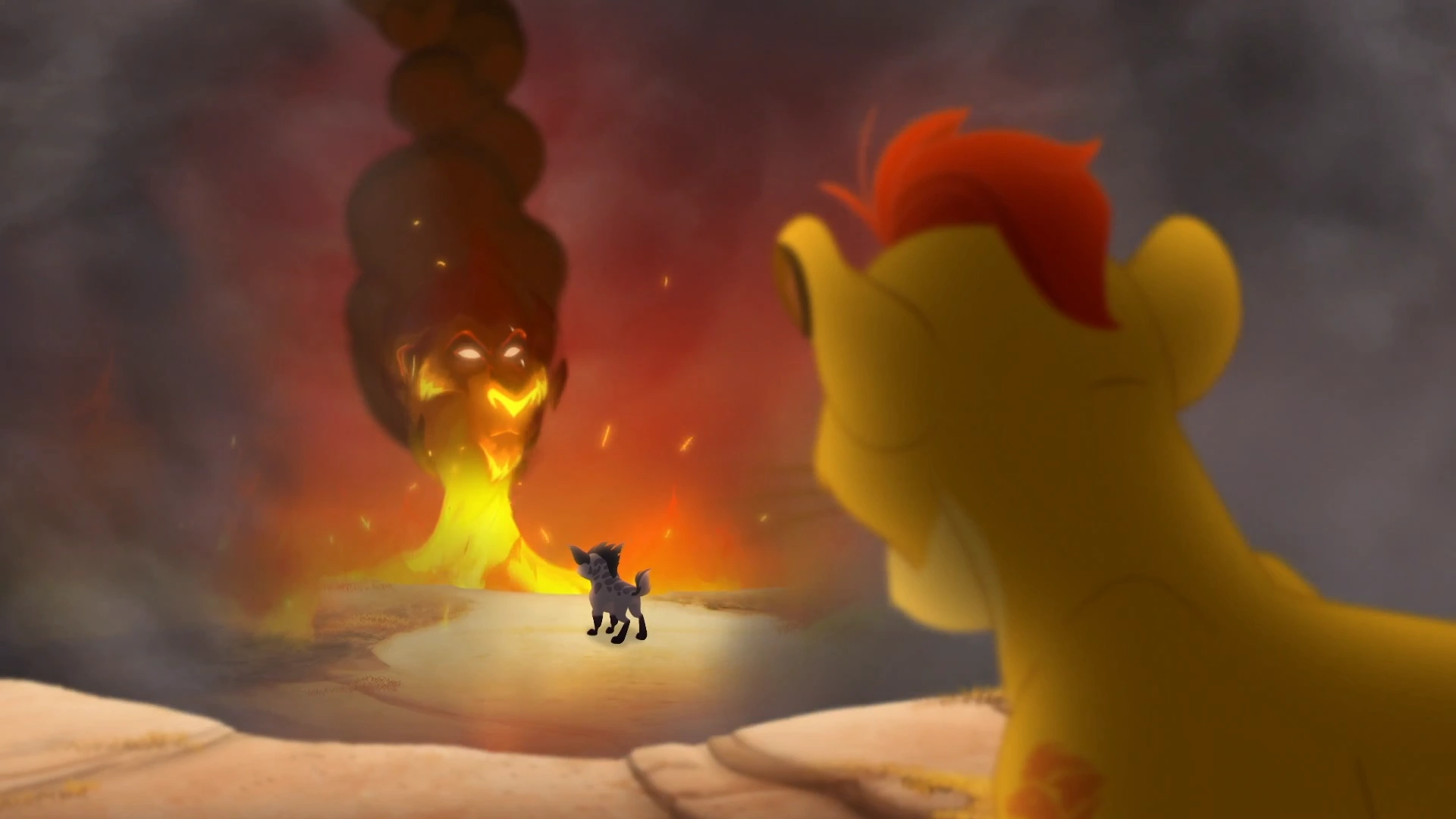The plan nearly succeeds, but is ultimately thwarted when the rest of the Guard arrives just in time, and Kion uses the Roar of the Elders to send the hyenas flying away. After landing near the volcano, Janja, Cheezi, and Chungu decide not to return to Scar immediately, knowing that he will be furious at them for their failure. As they begin to walk away, however, Ushari arrives and coldly informs them, that Scar wishes to see them and isn't happy. Then, a small eruption can be seen at the top of the volcano, apparently confirming this.